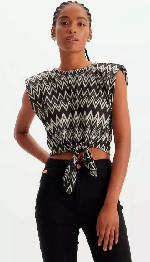 Descubra a elegância e o estilo da blusa Lança Perfume, uma peça que combina sofisticação e conforto. Com uma modelagem muscle e um comprimento mais curto, ela se destaca pela sua estampa vibrante e pelo detalhe de amarração frontal que valoriza a silhueta feminina. As ombreiras conferem um toque moderno e sofisticado, tornando esta blusa perfeita para diversas ocasiões.