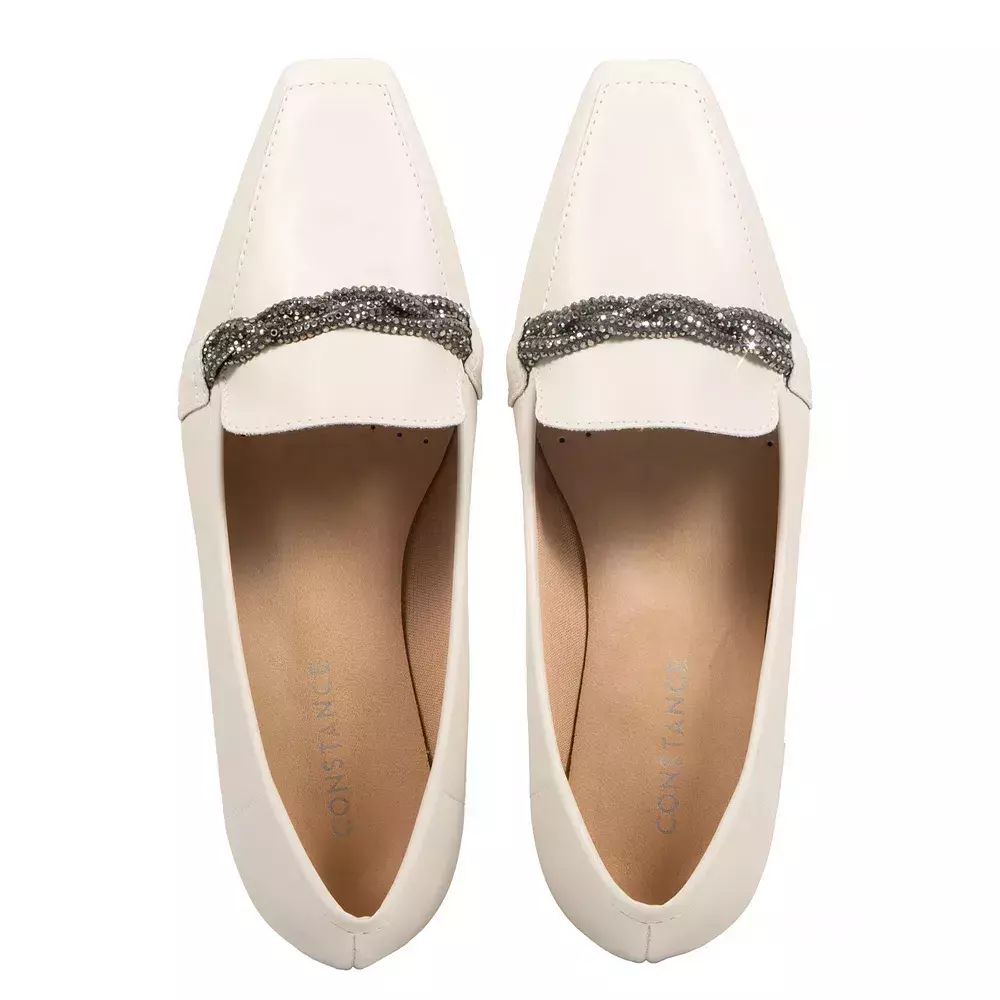 MOCASSIM OFF WHITE TRANÇA STRASS. CALÇADO CONFORTÁVEL E ELEGANTE, COM UMA TRANÇA DE STRASS EM COR ÔNIX NO CABEDAL. POSSUI O BICO QUADRADO E CALCE FÁCIL. MUITO PRÁTICO E VERSÁTIL, É PERFEITO PARA O DIA A DIA.